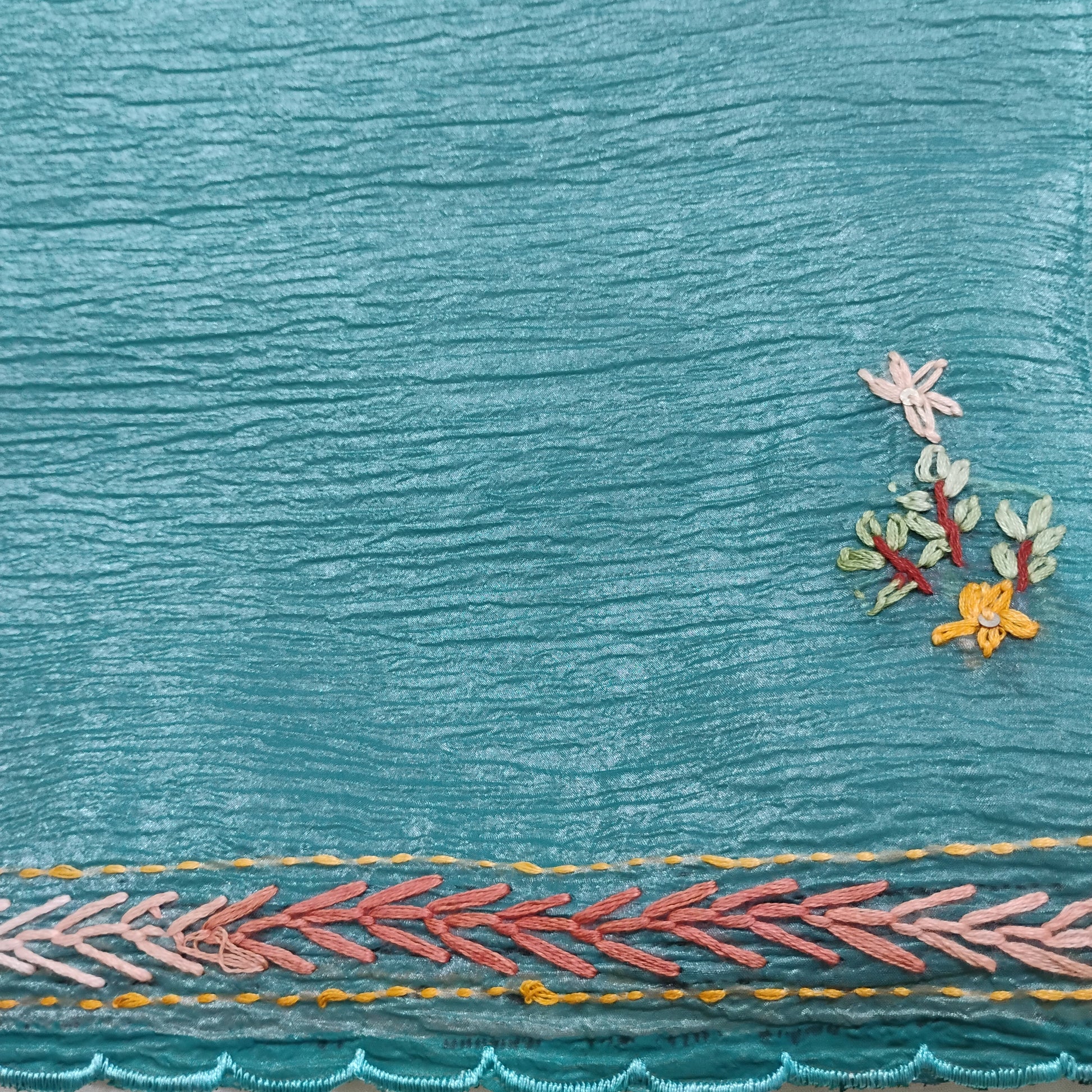 Experience elegance with this cyan-blue saree featuring intricate embellished work and a graceful tree pattern. Its vibrant hue combined with detailed craftsmanship makes it perfect for festive occasions or special gatherings, helping you stand out with subtle sophistication and charm.