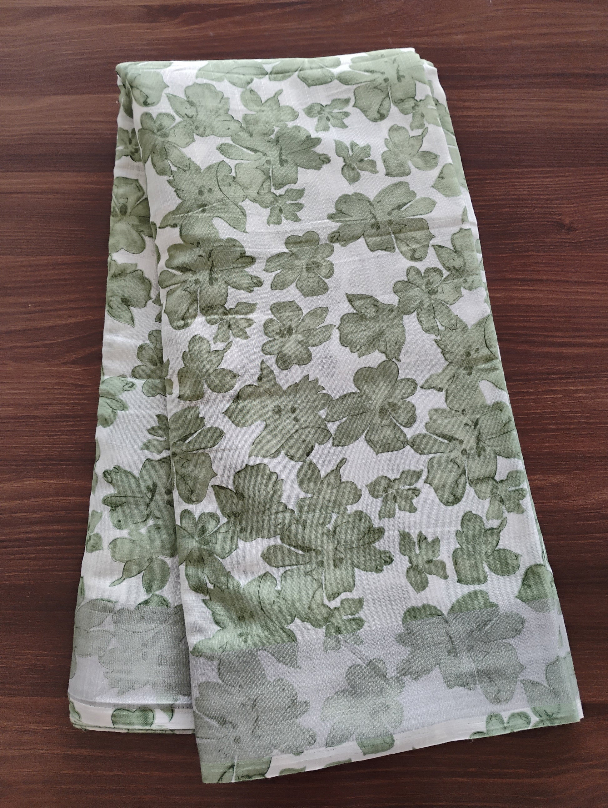 Embrace effortless elegance with this LinenCotton Green White Floral Saree. Crafted from a breathable blend of linen and cotton, it ensures comfort throughout the day while the delicate green and white floral design adds a fresh, natural charm. Ideal for both casual and festive occasions, this saree combines style and ease, making it a versatile addition to your wardrobe.